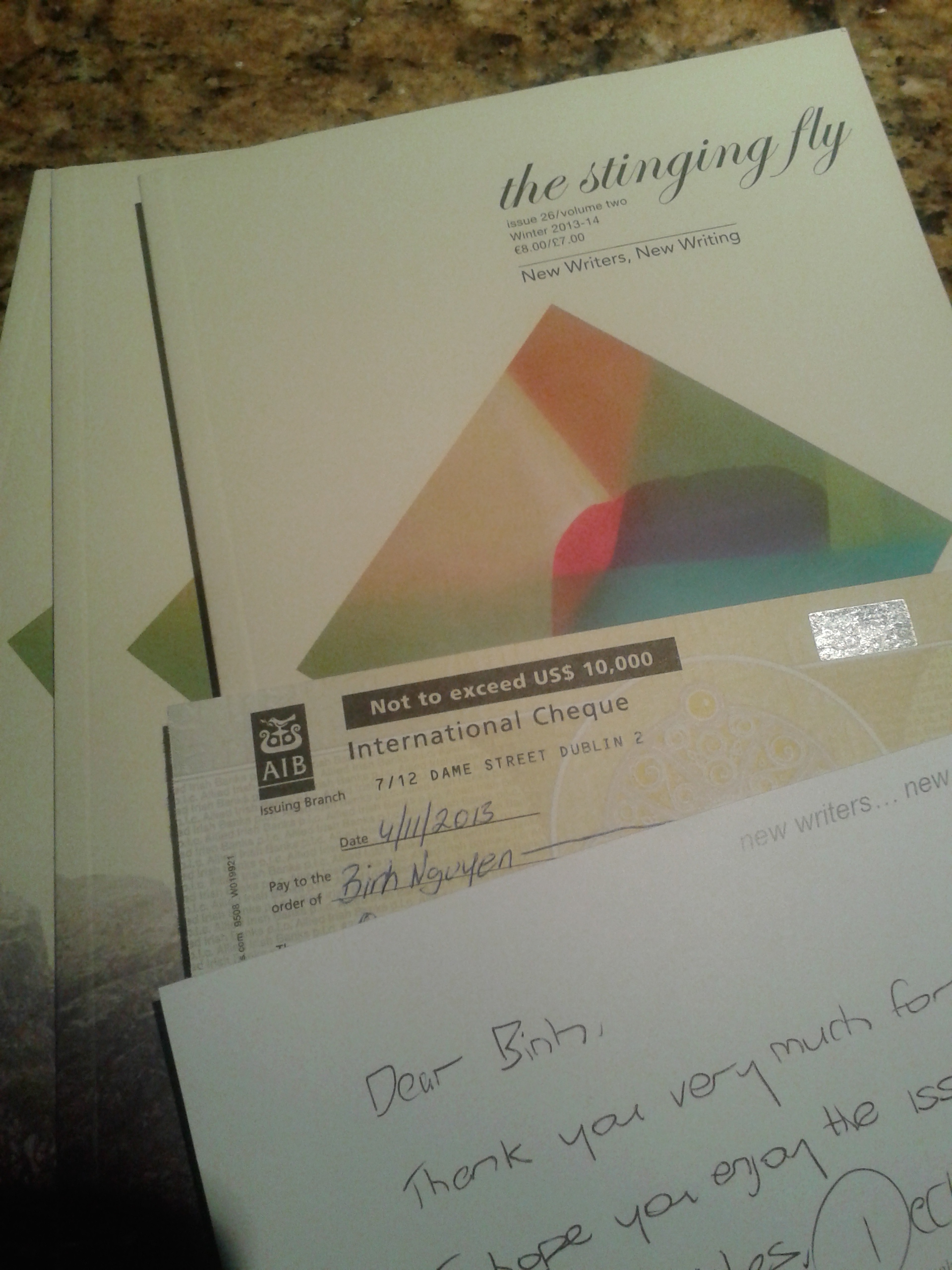 20131117_115010Delighted to have received my contributor’s copies and check yesterday from the Fly. I slunk down onto the floor in the corridor, in a rush of joy and happiness after coming home late last night and seeing it there.